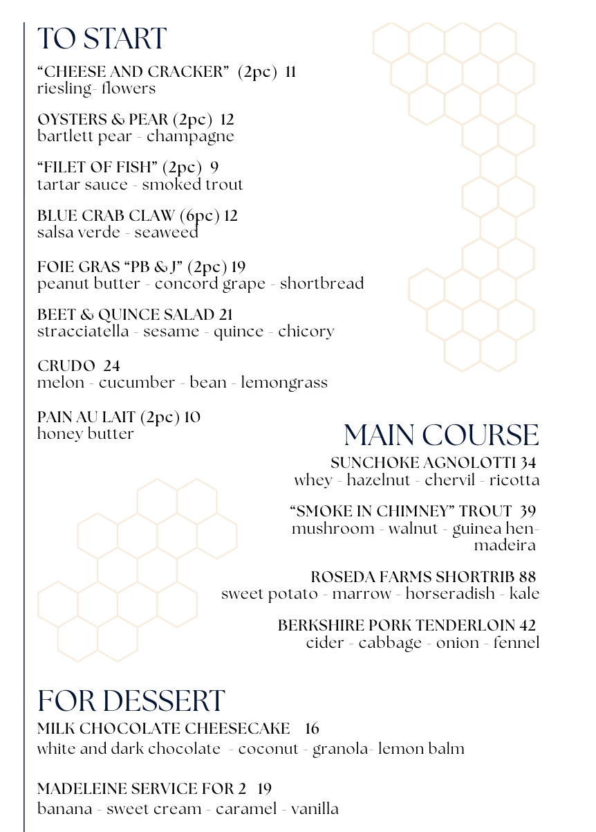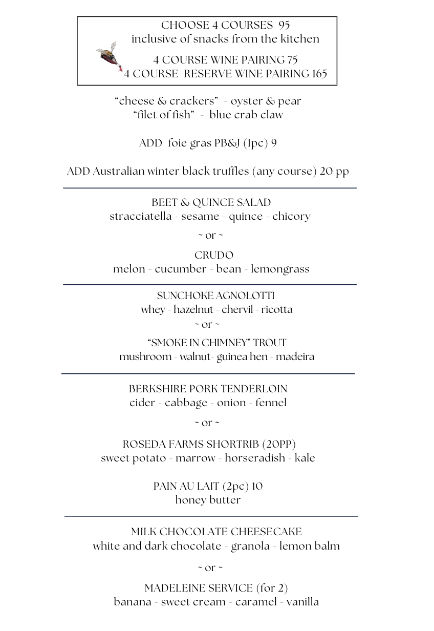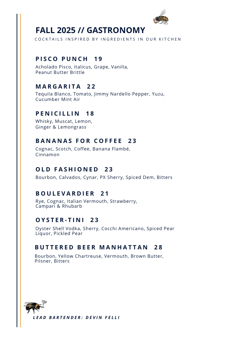 Menu does not include tax and gratuity. In order to ensure that our team earns a competitive wage, a 20% service fee will be added to the final bill.